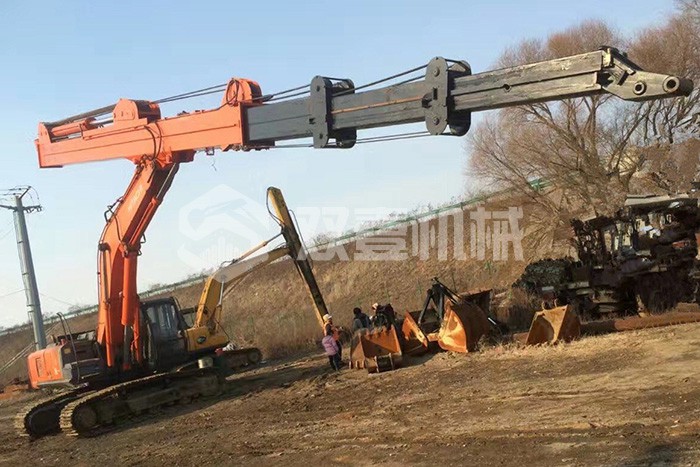 超長四節臂:總長度可達48米,臂內可再伸出3節,施工深度42.5米,配帶貝殼斗1.8立方或挖掘斗1.0立方。